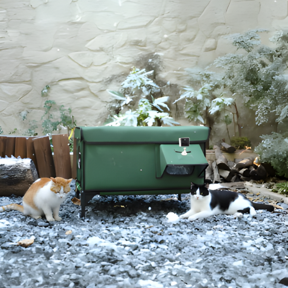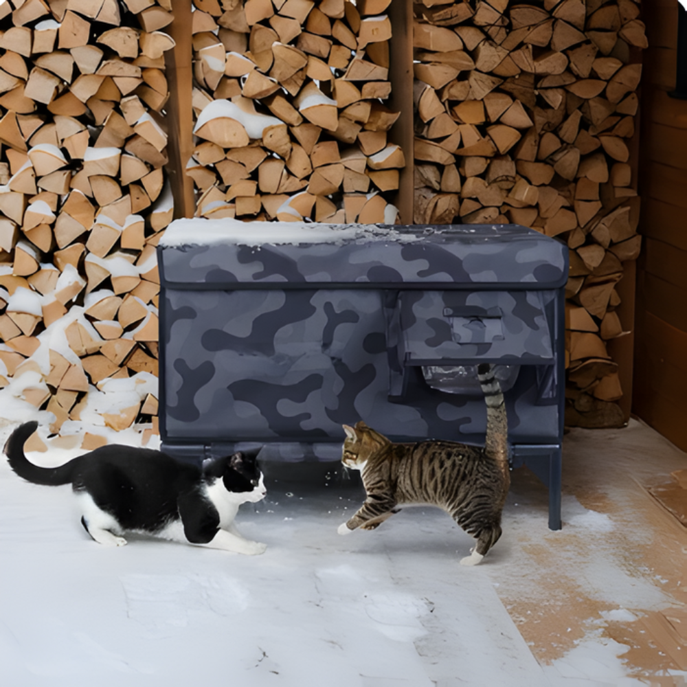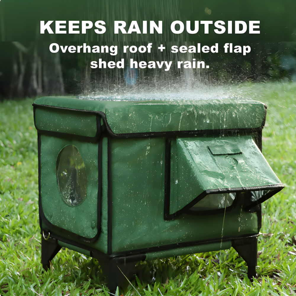 AllGuard cat house keeps outdoor cats warm, dry, and secure year-round. A waterproof PVC-coated shell, insulated walls, and an elevated staked base handle rain, snow, and wind. Dual doors (front + rear escape) improve safety; optional camera slots; pairs with our low-voltage MET-certified heating pad.
